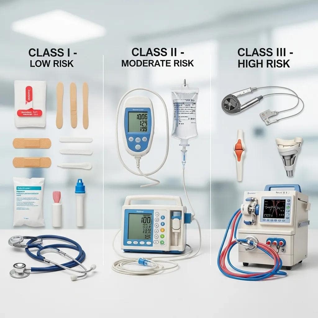 Class I (lowest risk), Class II (moderate risk), and Class III (highest risk). Each class carries distinct regulatory obligations.